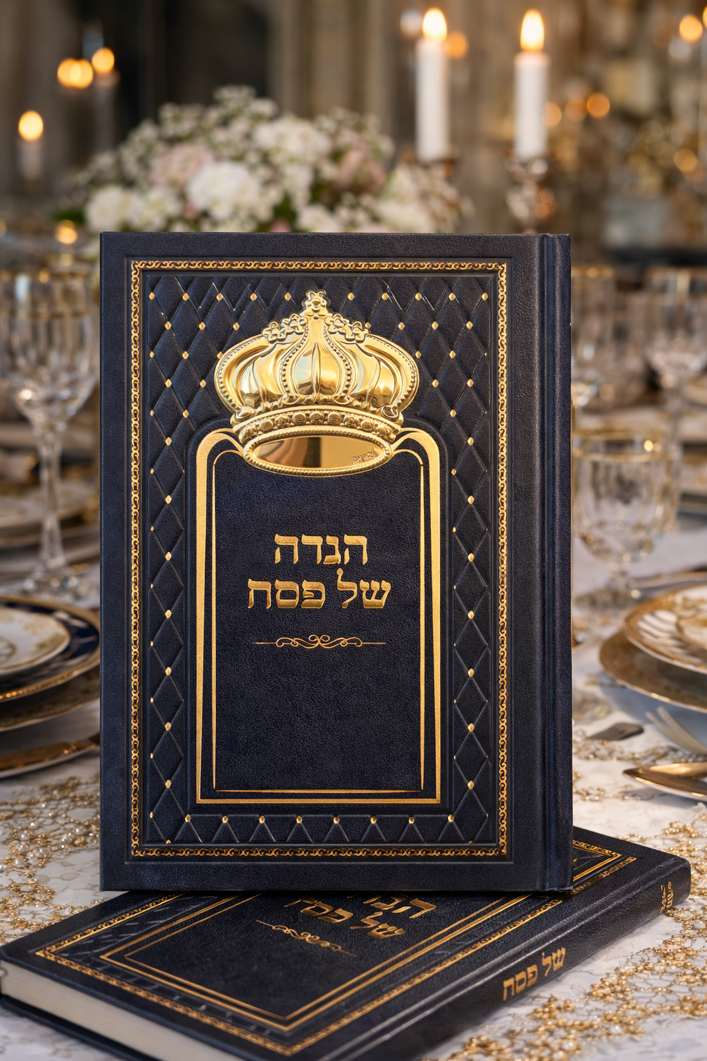 עיצוב מלכותי: הכריכה מעוטרת בהטבעות זהב ובמרכזה סמל כתר יוקרתי המעניק לה נוכחות מרשימה על שולחן החג.
