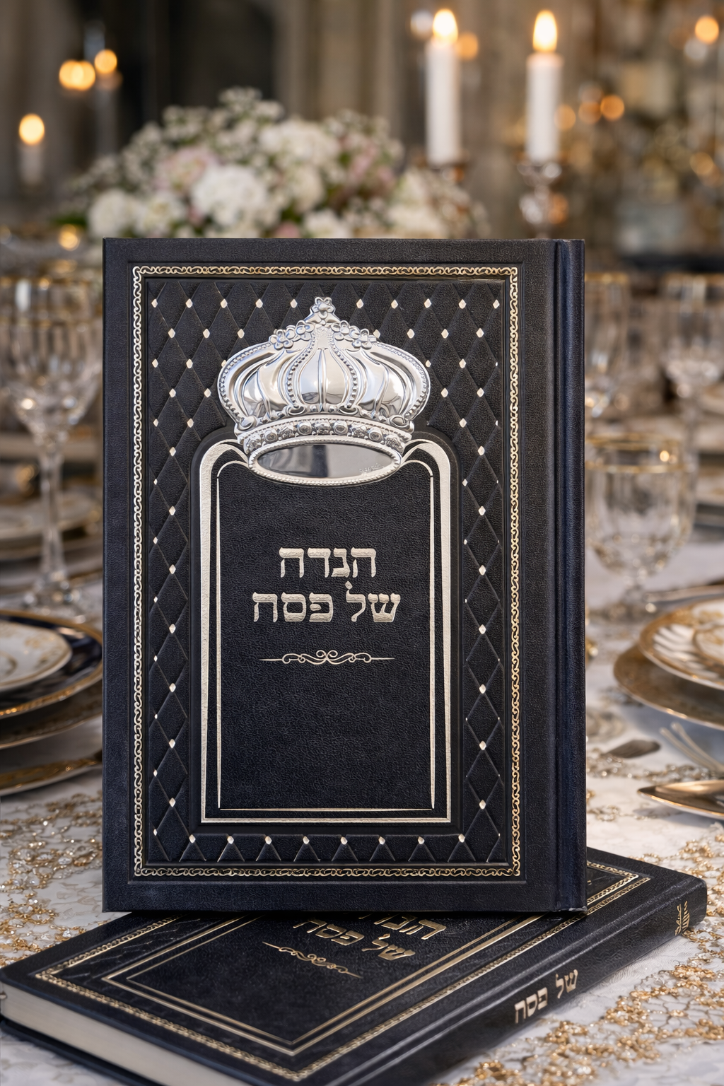 עיצוב מלכותי: הכריכה מעוטרת בהטבעות כסף ובמרכזה סמל כתר יוקרתי המעניק לה נוכחות מרשימה על שולחן החג.