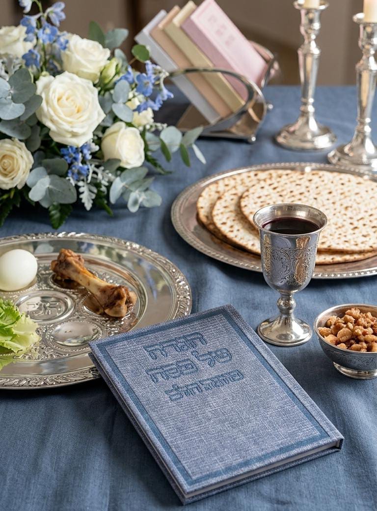 למי שרוצה לשבור את המראה המסורתי עם טאץ’ עיצובי עכשווי ומלא בסטייל. הגדת “ליל התכלת” בגוון כחול-אפור עמוק משדרת רוגע, אלגנטיות וחדשנות, ומשתלבת בצורה מושלמת עם כלי כסף וסידורי פרחים לבנים.