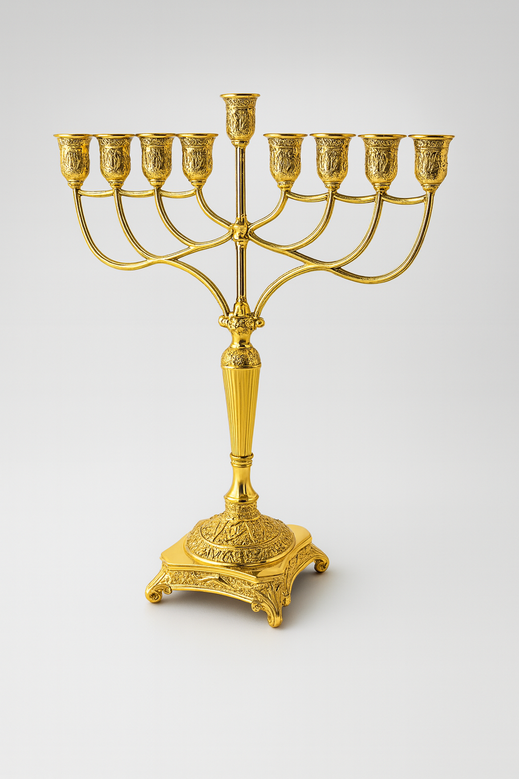 חנוכייה מרהיבה בעיצוב קלאסי מפוסל בעבודת יד, בגימור זהב בוהק ומלא נוכחות.קני החנוכייה המעוגלים והבסיס המעוטר בפרטים עדינים יוצרים מראה מהודר ומלכותי, השומר על נאמנות למסורת לצד אלגנטיות מודרנית.