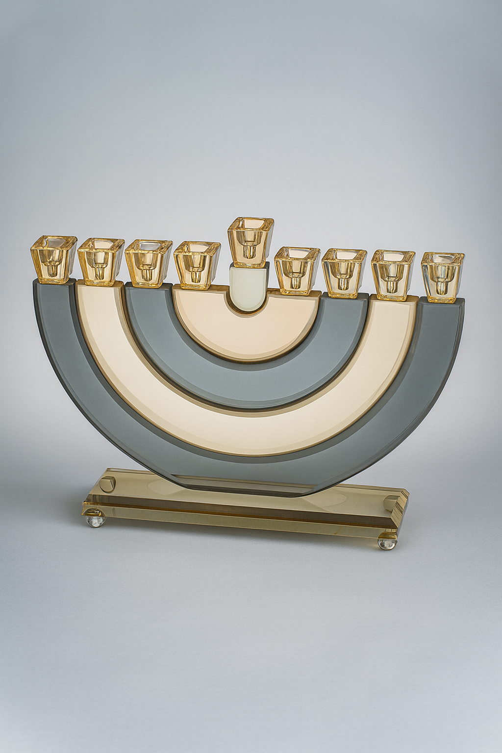 חנוכייה מודרנית ואלגנטית בעיצוב חצי עיגול מרהיב, עשויה מקריסטל איכותי בגווני שחור וזהב המשתלבים בהרמוניה מושלמת. העיצוב הנקי עם הפסים הקונצנטריים יוצר מראה יוקרתי ונוצץ – שילוב מדויק בין מסורת לבין עיצוב עכשווי.
