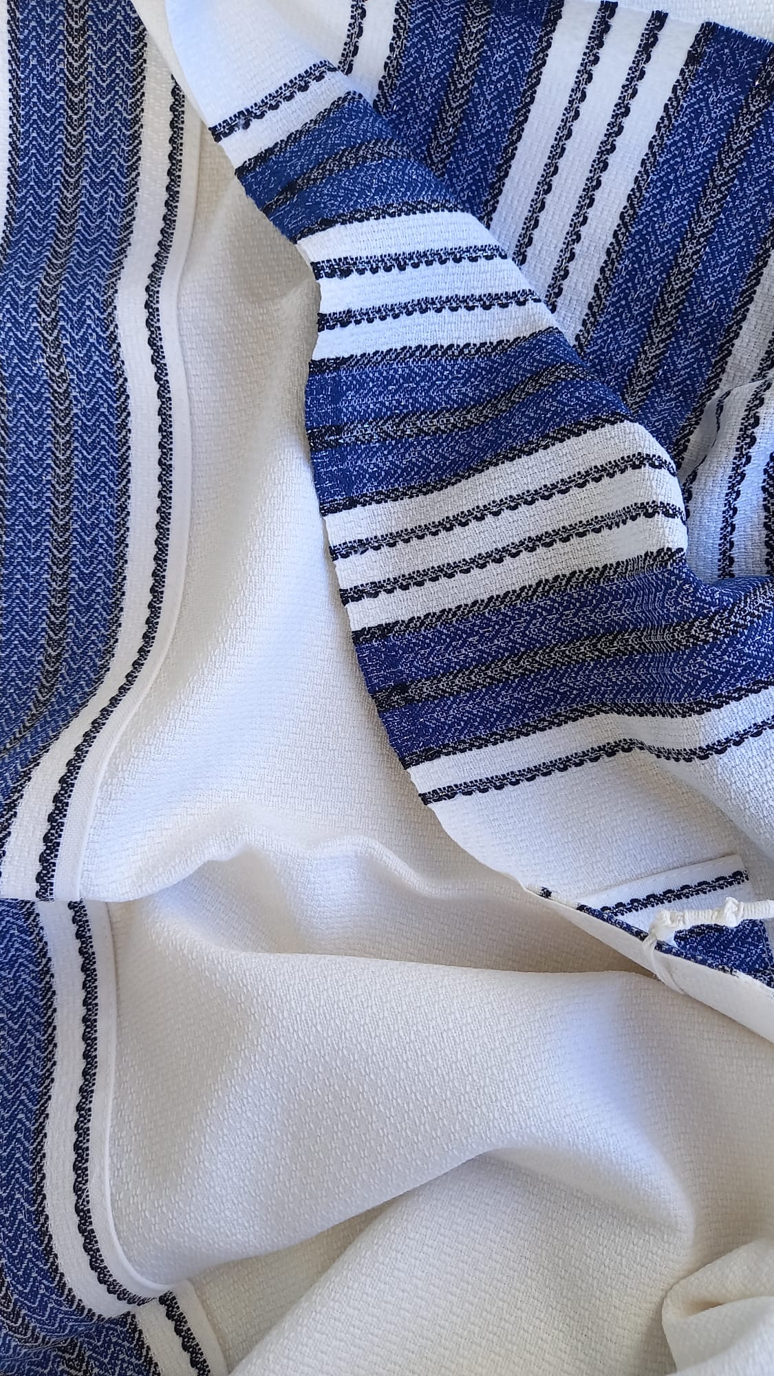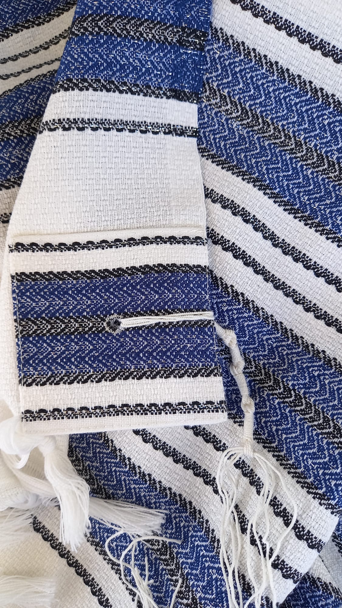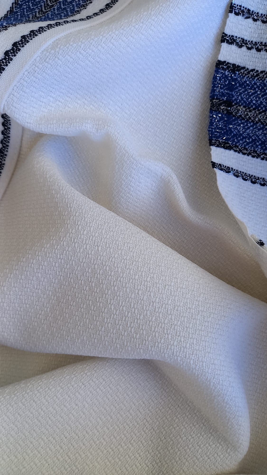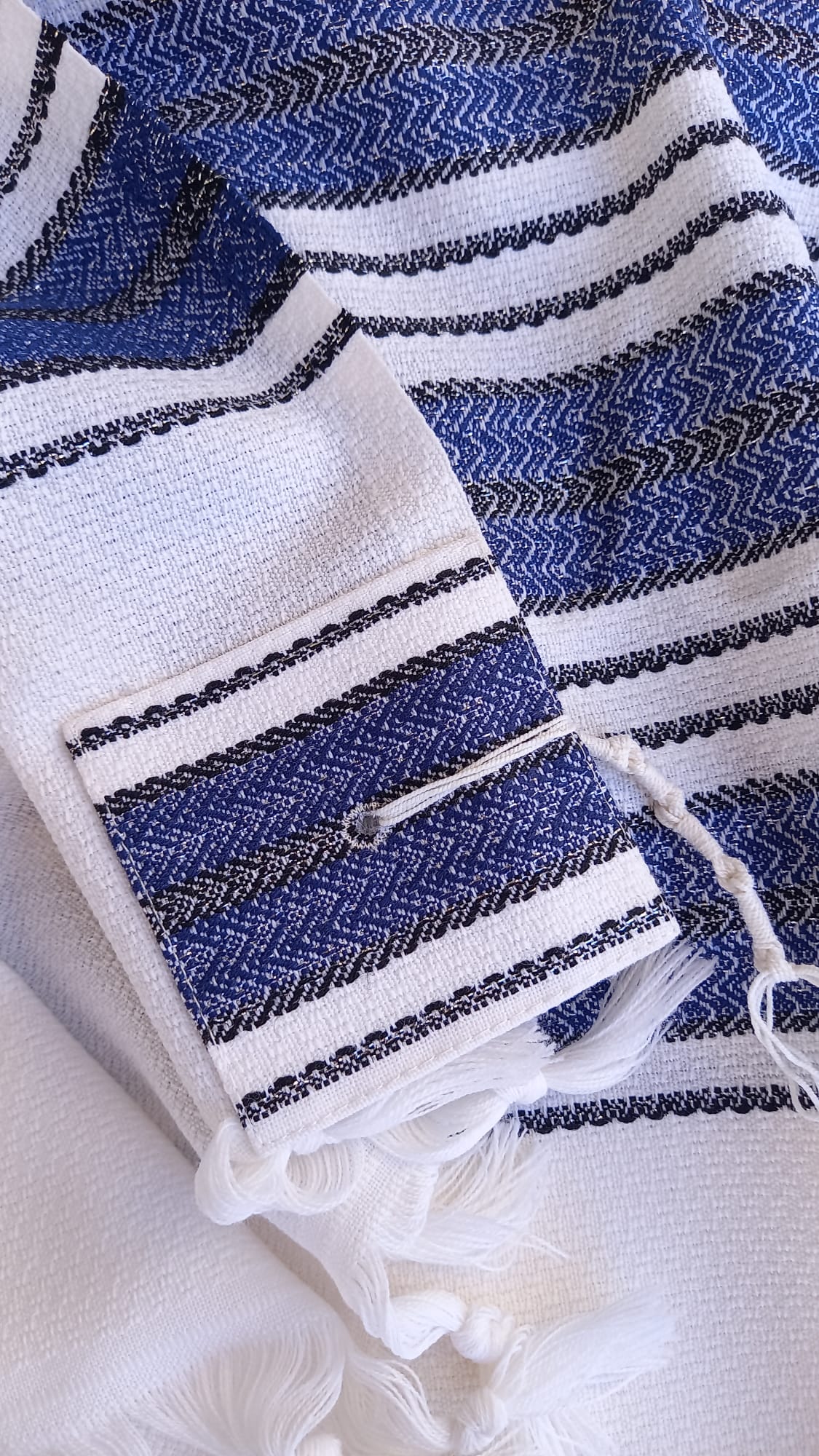אריגת “עבודת יד”: הטכניקה הייחודית מעניקה לבד נפח ונוכחות, וגורמת לטלית “לשבת” בצורה יציבה ומרשימה על הכתפיים מבלי להחליק.