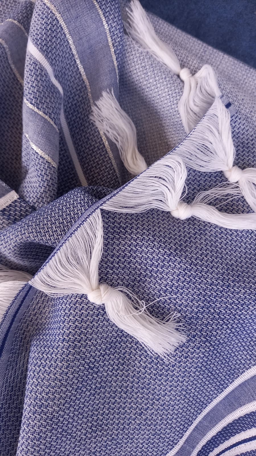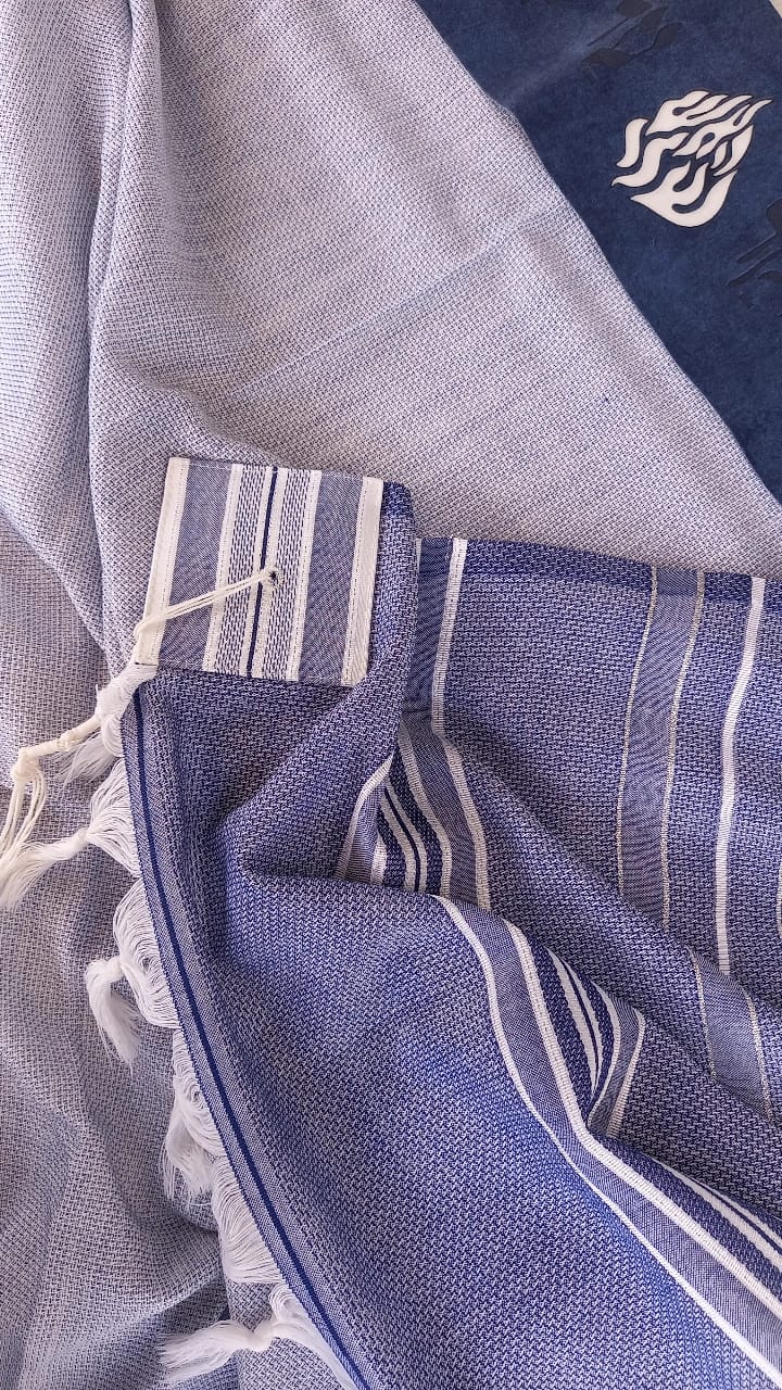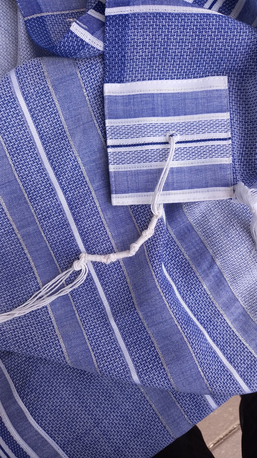 עיצוב ייחודי: הטלית מתאפיינת בפסי תכלת וכחול עמוק, המשתלבים עם פסי כסף עדינים (לורקס) שמעניקים לה ניצוץ של חגיגיות ותנועה, ממש כמו מנגינה.