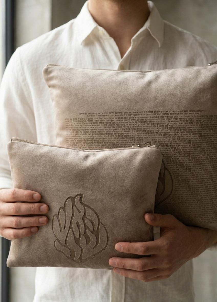 כיסוי התפילין – מינימליזם מקודש: כיסוי התפילין התואם מציג את סמל הלהבה ברקמה מובלטת ונקייה, המשלים את המראה היוקרתי והייחודי של הסט.