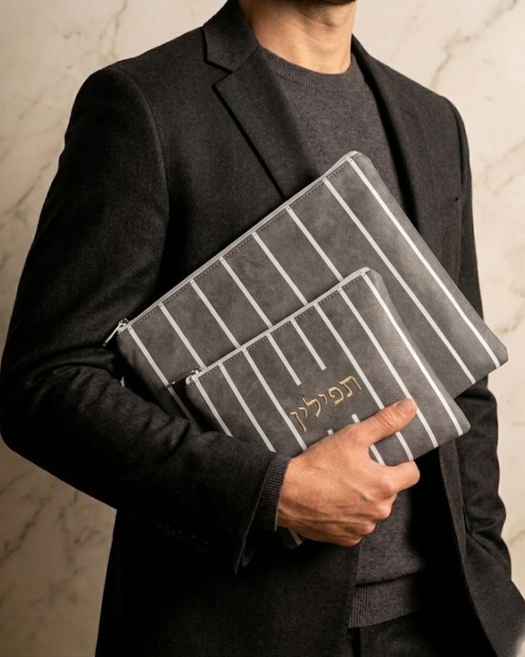 פרטי זהב יוקרתיים: הרקמה העדינה בזהב של המילים “טלית” ו”תפילין” מעניקה את הנגיעה הסופית של ההידור והיוקרה.