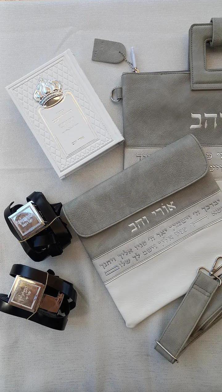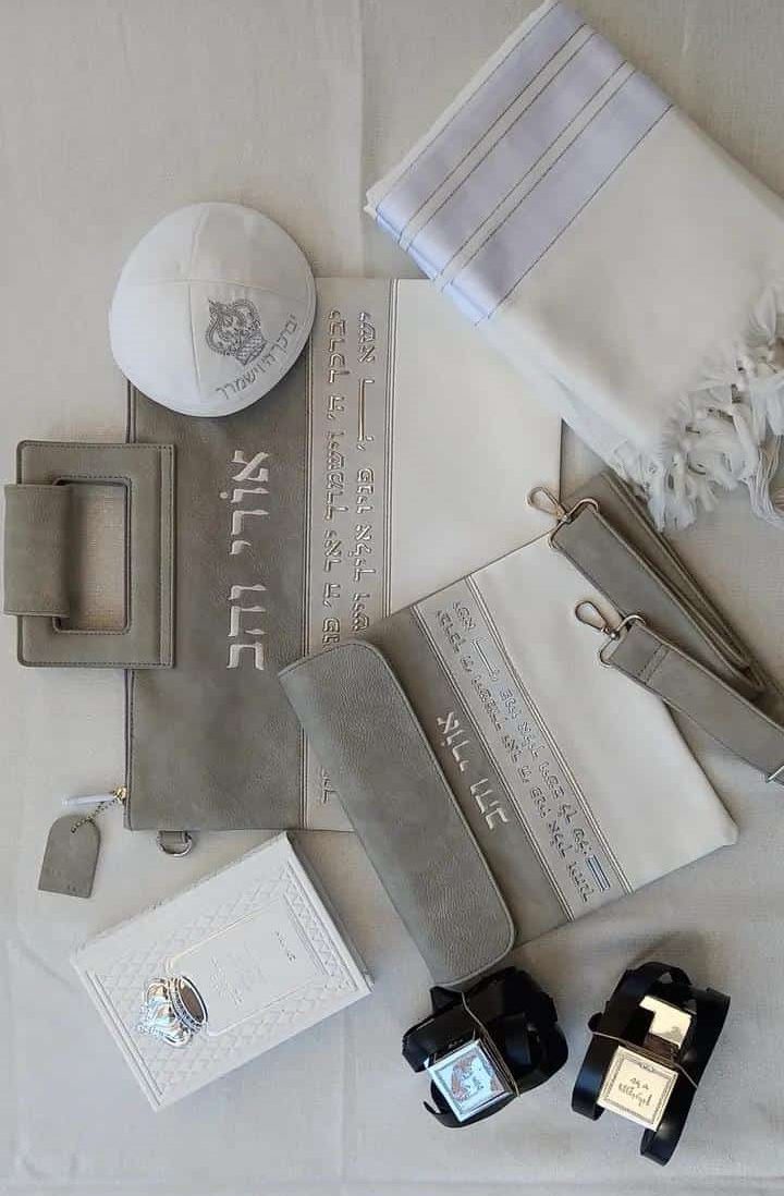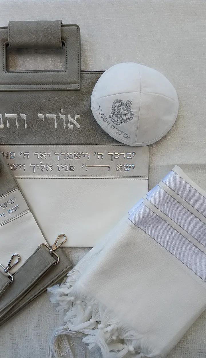 סט בר־מצווה מהודר בעיצוב אלגנטי בצבעי אפור-כסף-לבן, משולב רקמת פסוקים וכתר מלכות. סט איכותי, תואם ומוקפד עד הפרט האחרון, המעניק לבן המצווה חוויית קדושה מכובדת ויוקרתית.