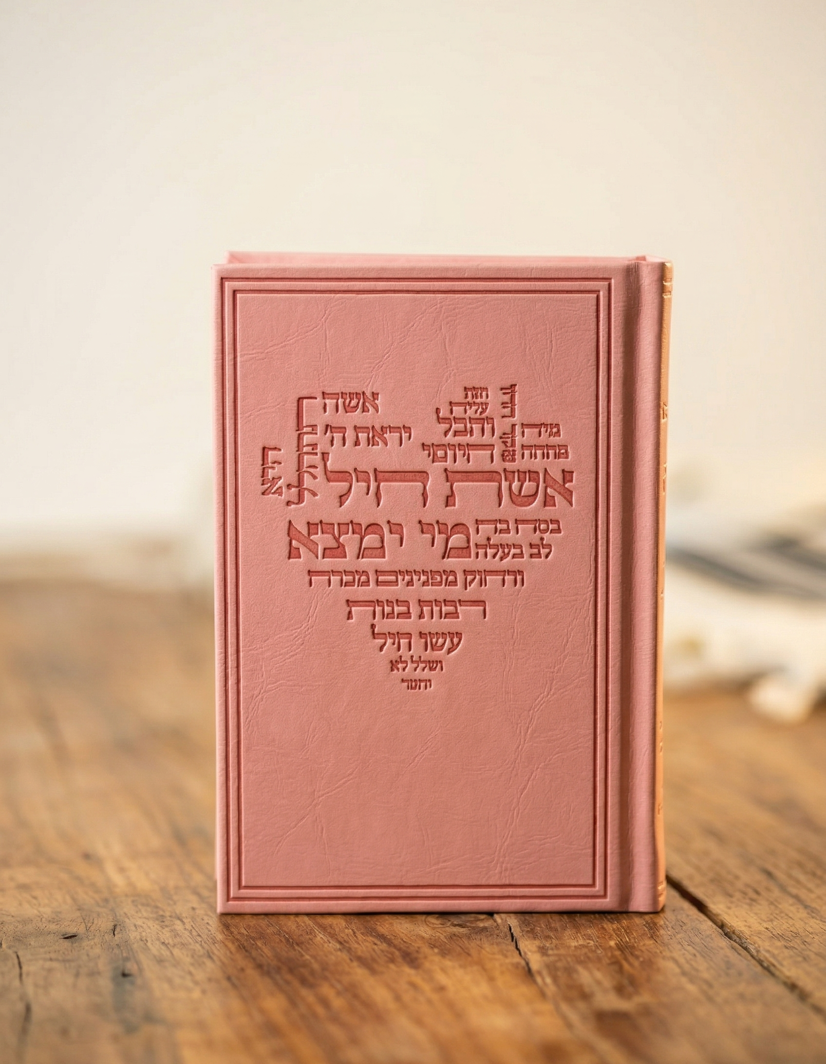 עיצוב “אשת חיל” ייחודי: כריכה קשה בגוון ורוד עתיק, עם הבלטה אומנותית של פסוקי “אשת חיל” היוצרים צורת לב.