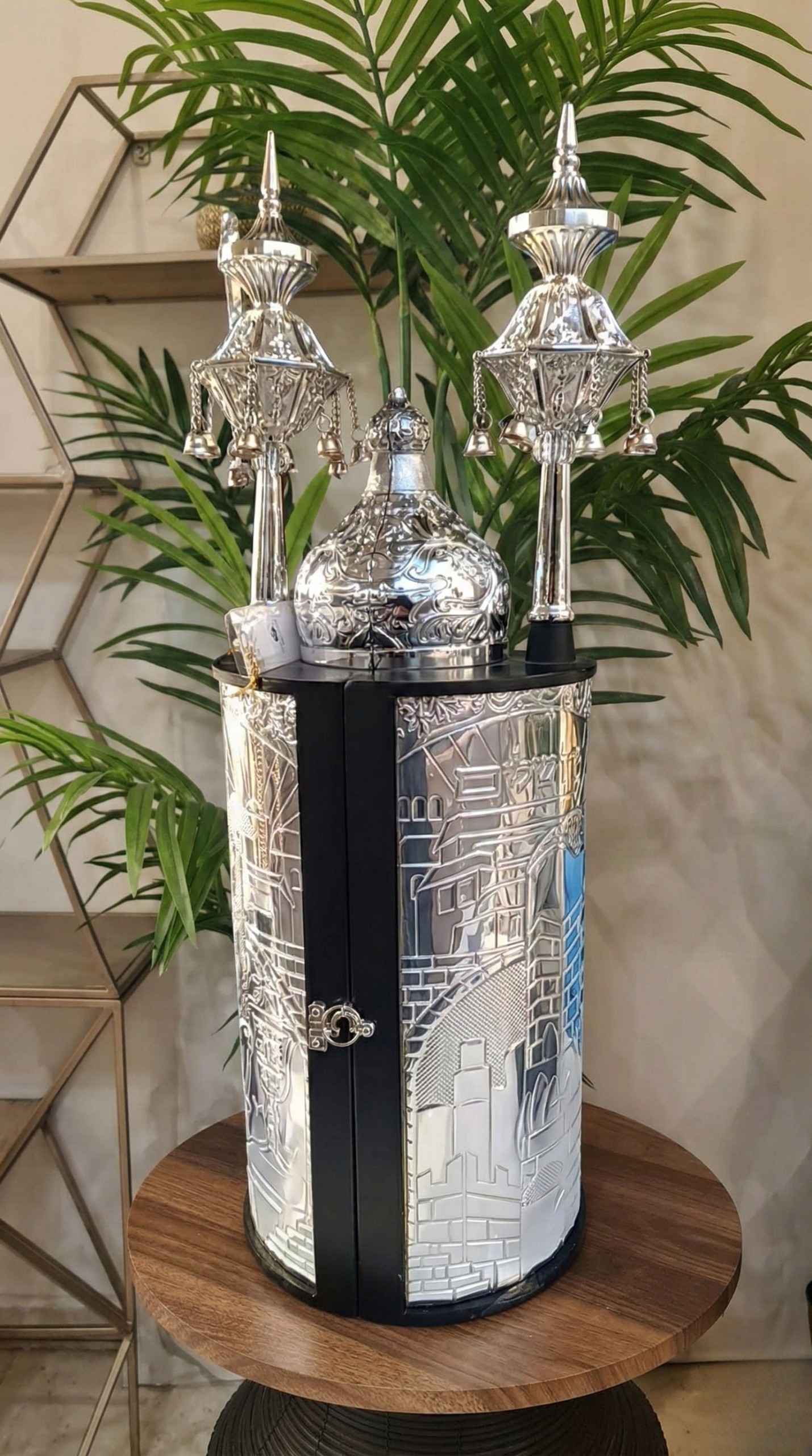 • עיצוב ירושלמי מרהיב: גוף התיק מעוטר בתבליטי כסף איכותיים המציגים את נופי ירושלים העתיקה, חומות העיר והכותל המערבי ברמת פירוט מדהימה.