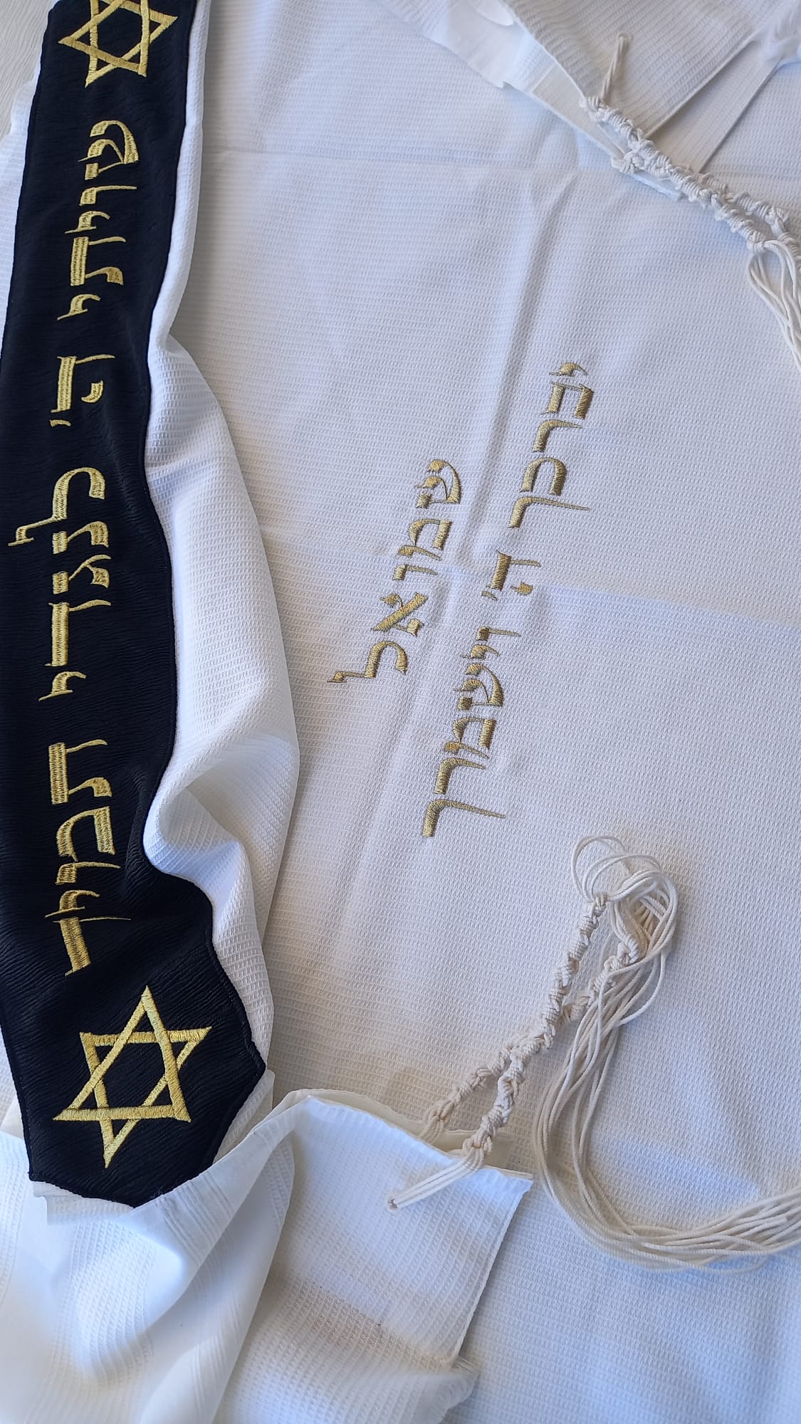טלית 100% דגם “שמואל” מהודרת – שילוב יוקרתי של לבן, שחור וזהב עם רקמה אישית