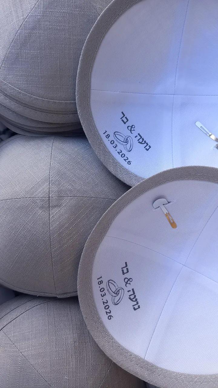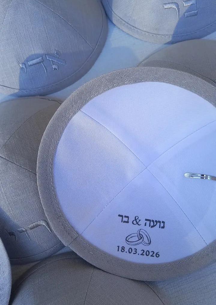הדפסה פנימית מעוצבת: הקדשה מיוחדת בתוך הכיפה עם שמות בעלי השמחה, תאריך האירוע וסמלים (כמו טבעות נישואין).